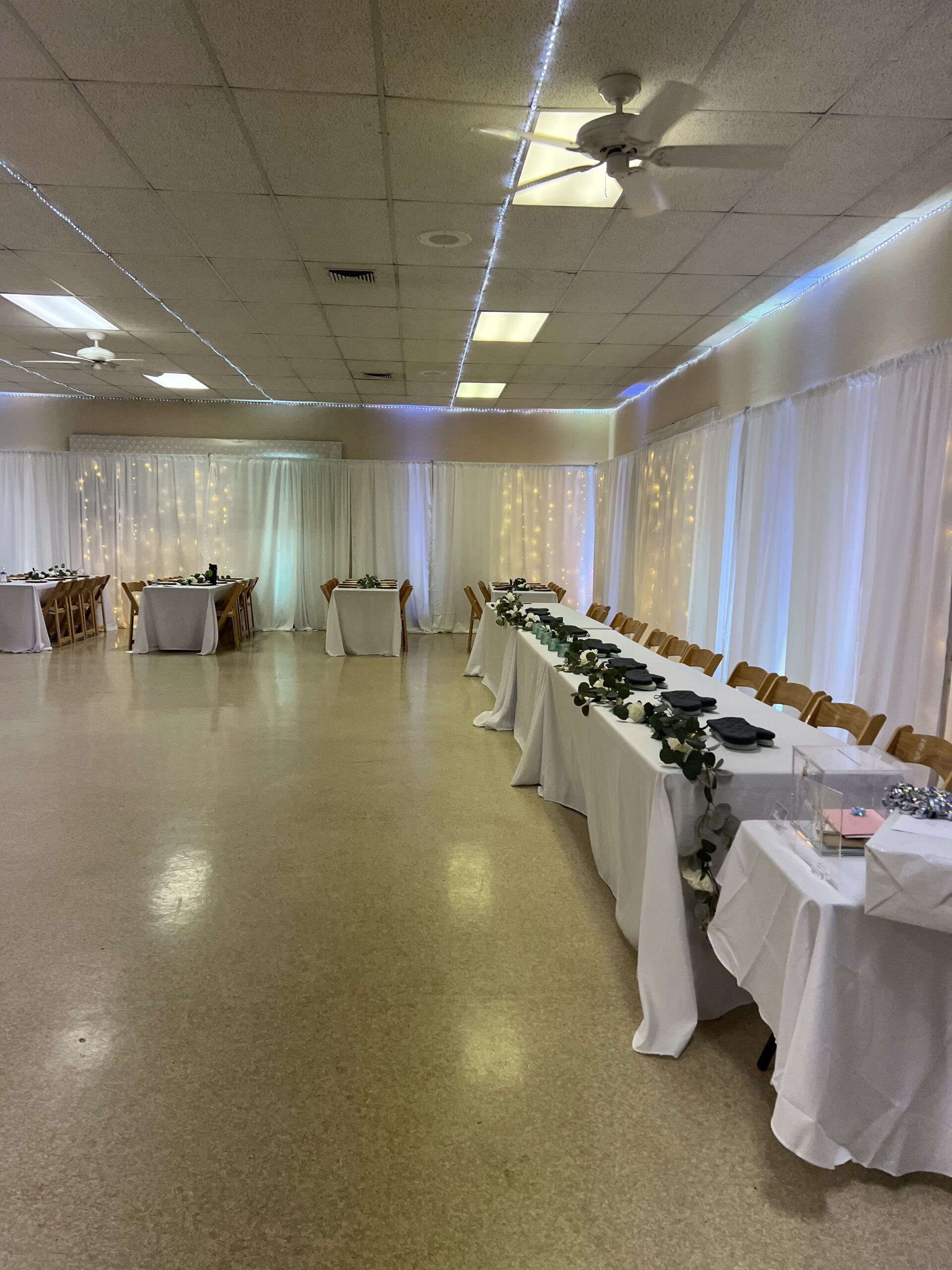 The dining hall can be used for conferences, meetings, dancing, and more. The dining hall is 39’ x 48’ and can hold up to 135 people in dining-style seating with tables and chairs, or up to 285 people standing or with chairs only. The dining hall includes a kitchen, with two stoves, two refrigerators, and lots of counter space.